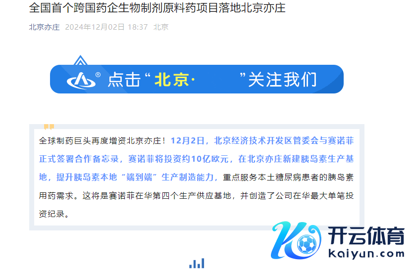 12月2日开云体育,北京经济本领斥地区管委会与赛诺菲认真签署相助备忘录,赛诺菲将投资约10亿欧元,在北京亦庄新建胰岛素坐褥基地,进步胰岛素腹地“端到端”坐褥制造能力开云体育,重心工作原土糖尿病患者的胰岛素用药需求。这将是赛诺菲在华第四个坐褥供应基地。据悉,这次新建树的胰岛素坐褥基地是跨国药企初度在国内布局生物制剂原料药坐褥。