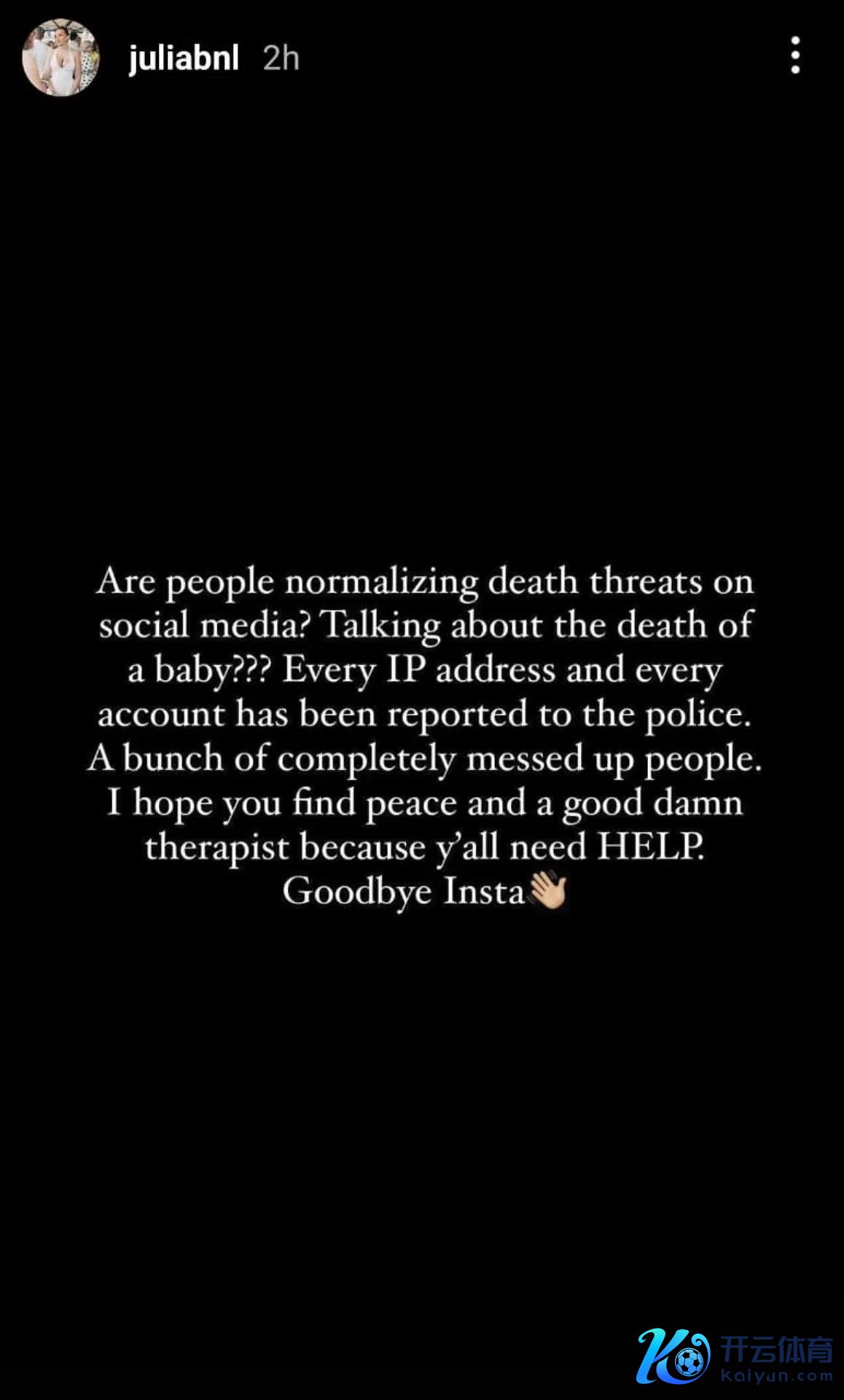 Bonilla在社媒上写谈:“东谈主们在酬酢媒体上将圆寂威逼宽绰化了吗?驳倒又名孩子的圆寂???每个IP地址和每个账户齐已向警方论说。一群脑子零散的东谈主。我但愿你们能找到轻柔的心思和又名活该的调养师,因为你们齐需要匡助。相遇,祝你们好运吧。”