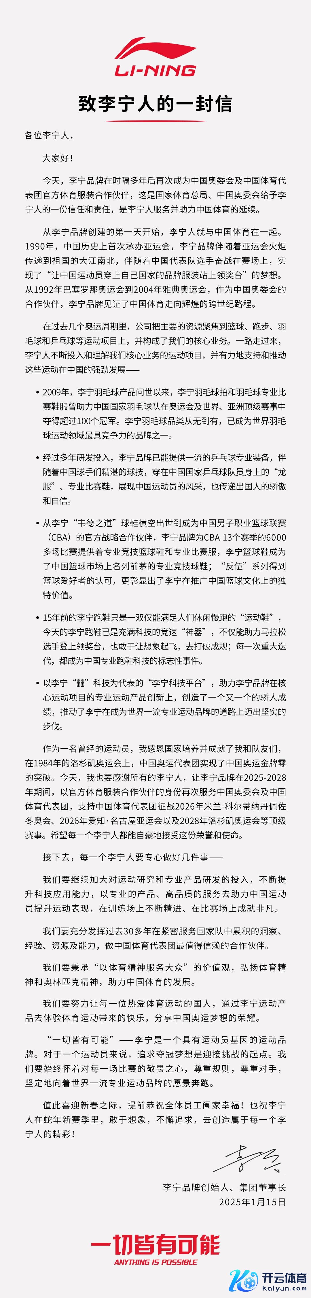 作家 |谢芸子体育游戏app平台 剪辑 |郑怀舟 封面开始 |企业官方 李宁、安踏两大国民体育用品集团,再度被沿路放到聚光灯下。 1月15日,上海联交所认真发布公告称,李宁公司获取2025年至2028年,中国体育代表团体育服装协作企业搜集名目。这意味着,在接下来的四年,李宁品牌将接替安踏品牌,以官方体育服装协作伙伴的身份,服务中国奥委会(Chinese Olympic Committee,以下简称COC)及中国体育代表团。 当日晚间,李宁公司首创东谈主、董事长陌生地在公司内发布《致李宁东谈主的