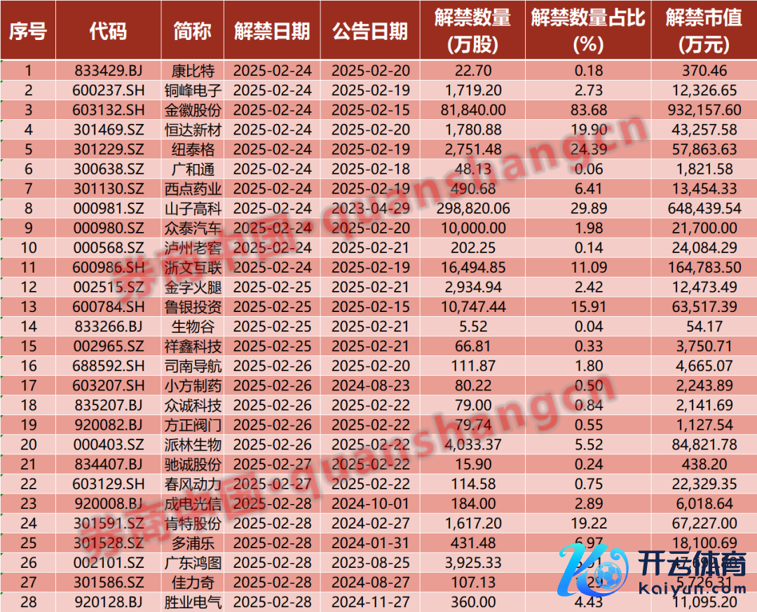 本周(2月24日到2月28日),A股市集将有28只股票濒临解禁,悉数解禁数目为43.91亿股,按最新收盘价计较,悉数解禁市值为227.37亿元。从解禁股情况来看,金徽股份解禁市值超90亿元,山子高科解禁市值超60亿元。