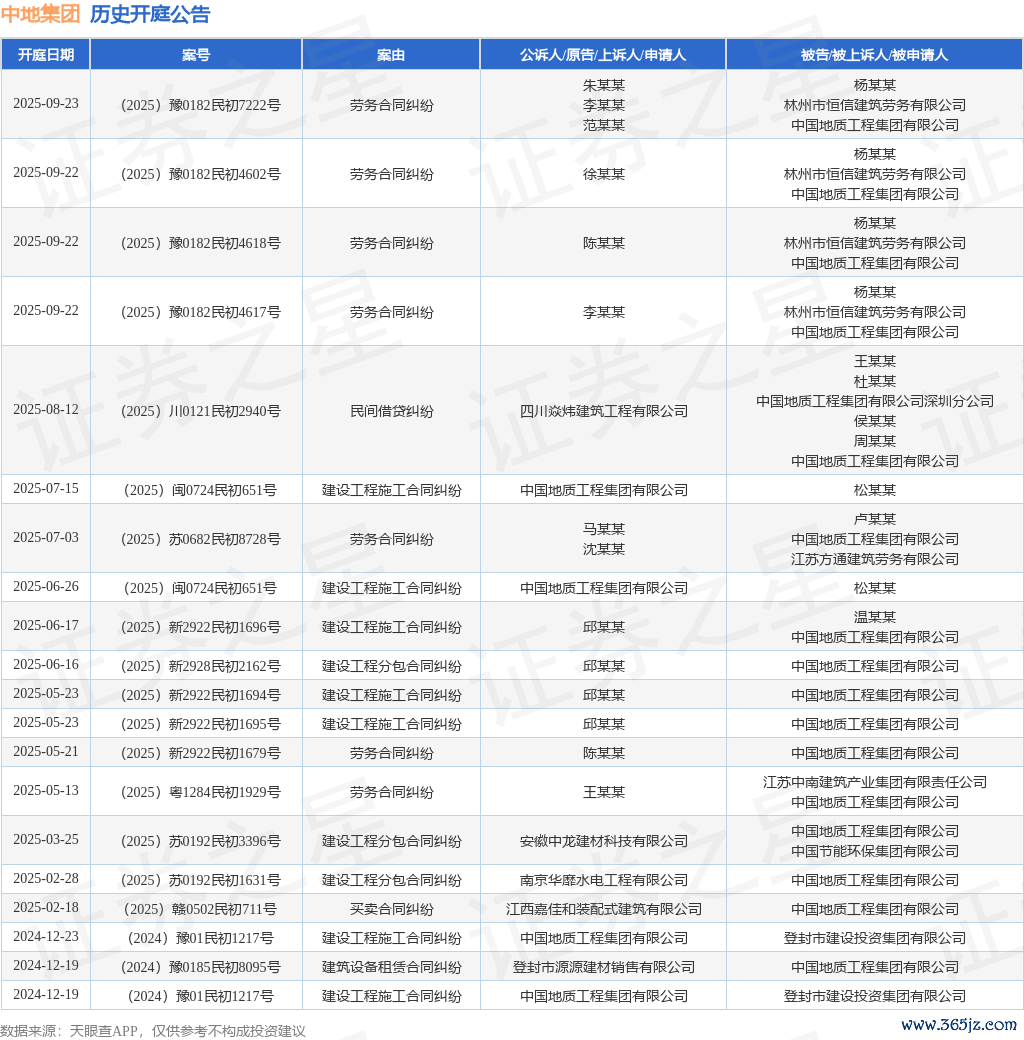 案号:(2025)川0121民初2940号审理法院:金堂县东说念主民法院案由:民间假贷纠纷当事东说念主信息: 原告/上诉东说念主:四川焱炜建筑工程有限公司 被告/被上诉东说念主:王某某、杜某某、中国地质工程集团有限公司深圳分公司、侯某某、周某某、中国地质工程集团有限公司开庭日历:2025年8月12日左证统计,近一年内以中国地质工程集团有限公司为当事东说念主的历史开庭公告有38则,其中案由为“开导工程施工协议纠纷”的公告以12则居首,其次为“劳务协议纠纷”有9则,“开导工程分包协议纠纷”有6则。历史开庭公告(前20条)如下: