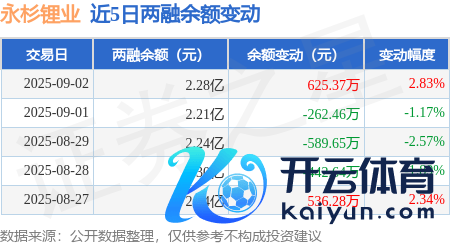 本站音尘,9月2日开云·kaiyun体育,永杉锂业(603399)融资买入2023.33万元,融资偿还1397.96万元,融资净买入625.37万元,融资余额2.28亿元,近20个交游日中有12个交游日出现融资净买入。