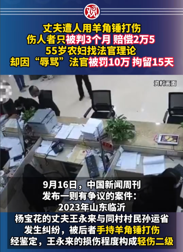 2025年6月,55岁的农妇杨宝花收到一份让她心凉的判决书:丈夫被村民用羊角锤打成轻伤二级,打东说念主者仅被判拘役三个月、抵偿2.5万元。 杨宝花思欠亨,揣着判决书冲到法院推弘大厅找法官表面。热枕振作时,她甩出一句:“谁这样判决,谁就莫得良心!” 效果话音未落,法院就地开出罚单——拘留15天,外加罚金10万元。
