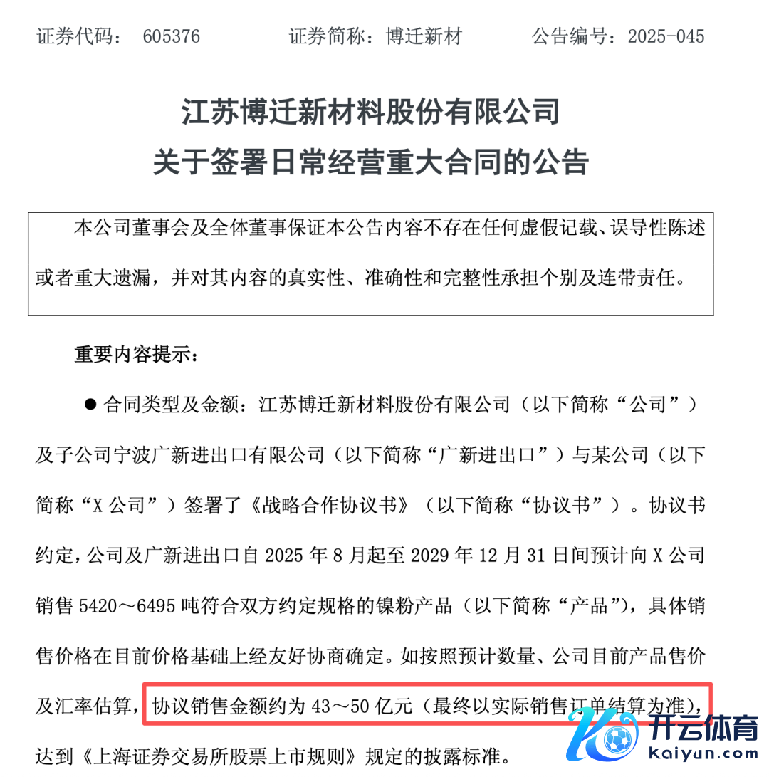 9月28日晚间,博迁新材(605376)公告称,公司及子公司广新收支口与某公司(下称“X公司”)签署《战术配合条约书》,商定自2025年8月起至2029年12月31日历间,展望向X公司销售5420—6495吨镍粉产物。按照展望数目、公司现在产物售价及汇率估算,销售金额约43亿元至50亿元。